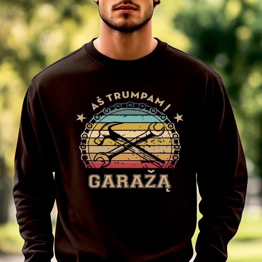 Juodos spalvos džemperis Aš trumpam į garažą lanku spalvotas